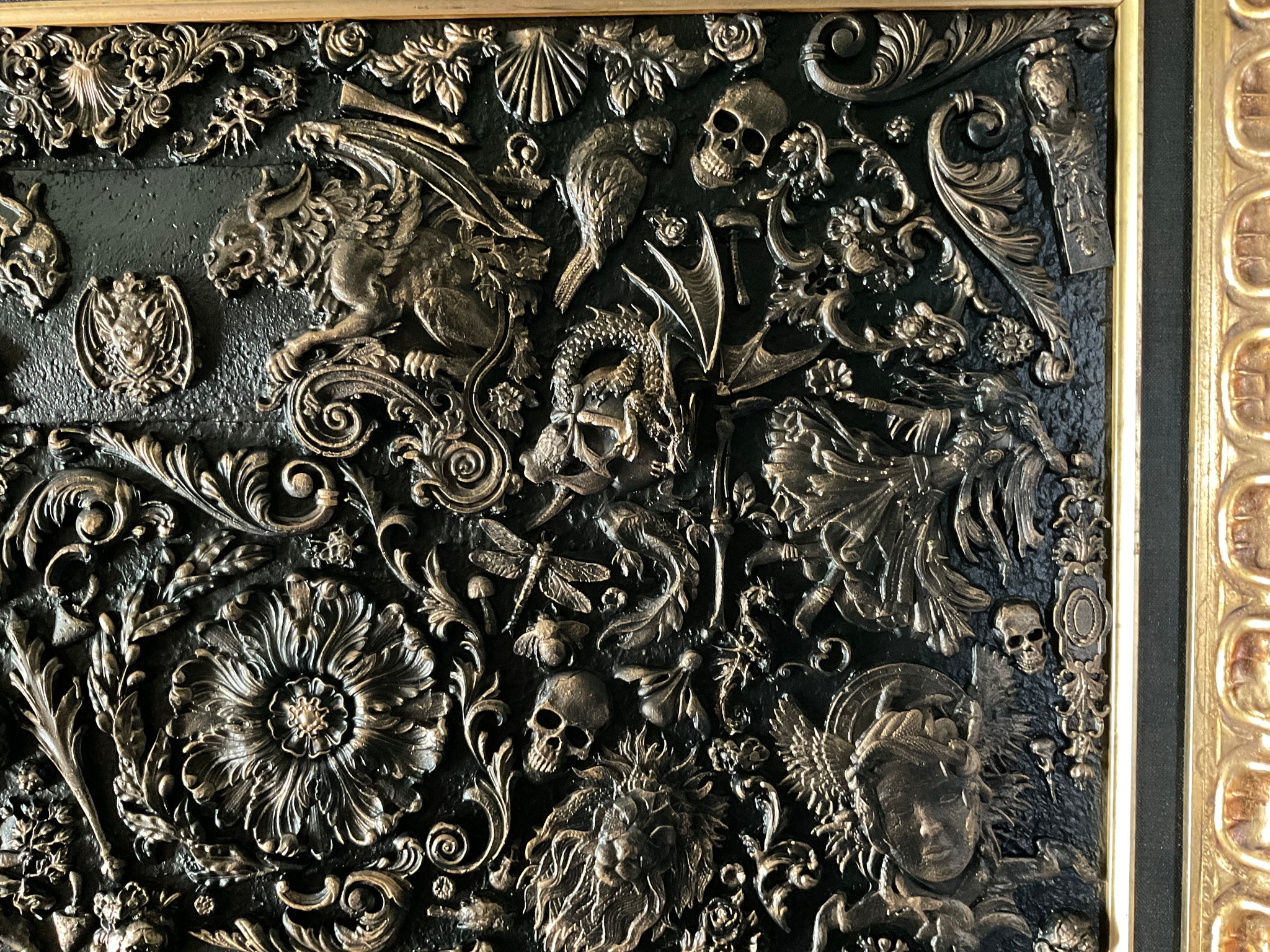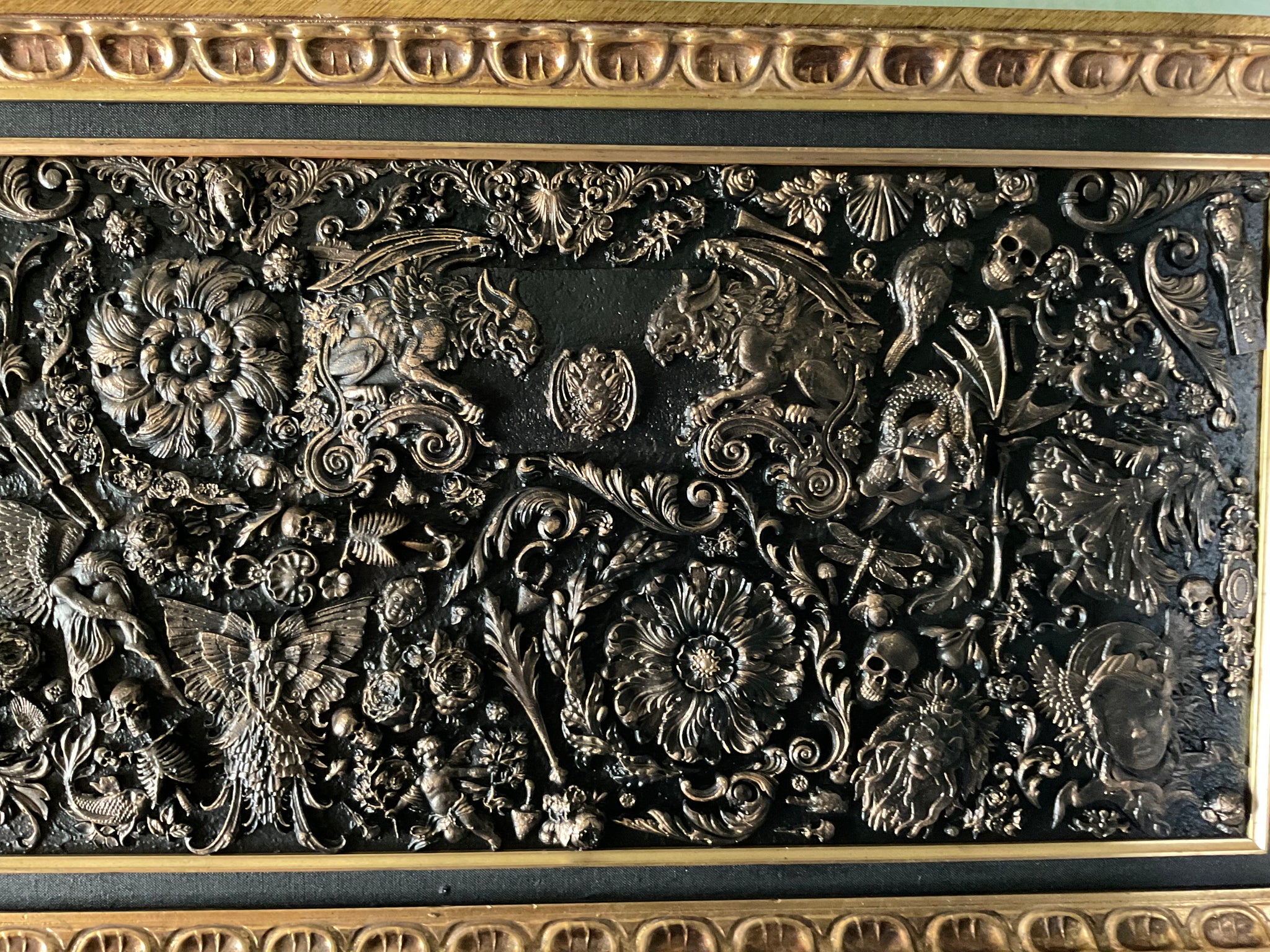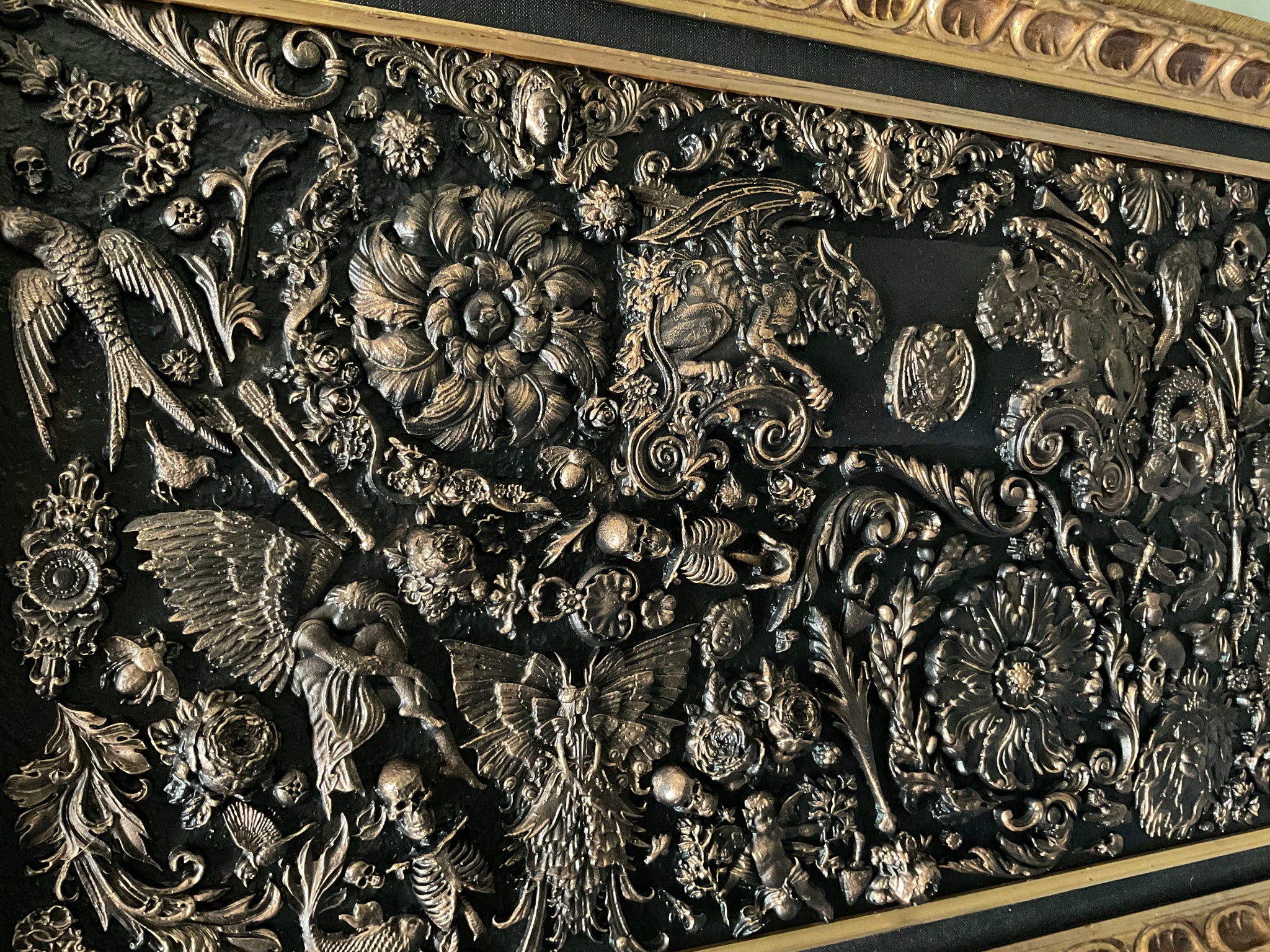 A richly detailed handcrafted wall panel featuring a blend of gothic and whimsical elements — gargoyles, skulls, fairies, birds, florals, and ornate Baroque-style motifs. Created using multiple moulds and finished in a gold/antique tone, this piece brings together dark elegance and enchanted storytelling. A striking statement artwork for lovers of fantasy, gothic decor, or unique handcrafted pieces.