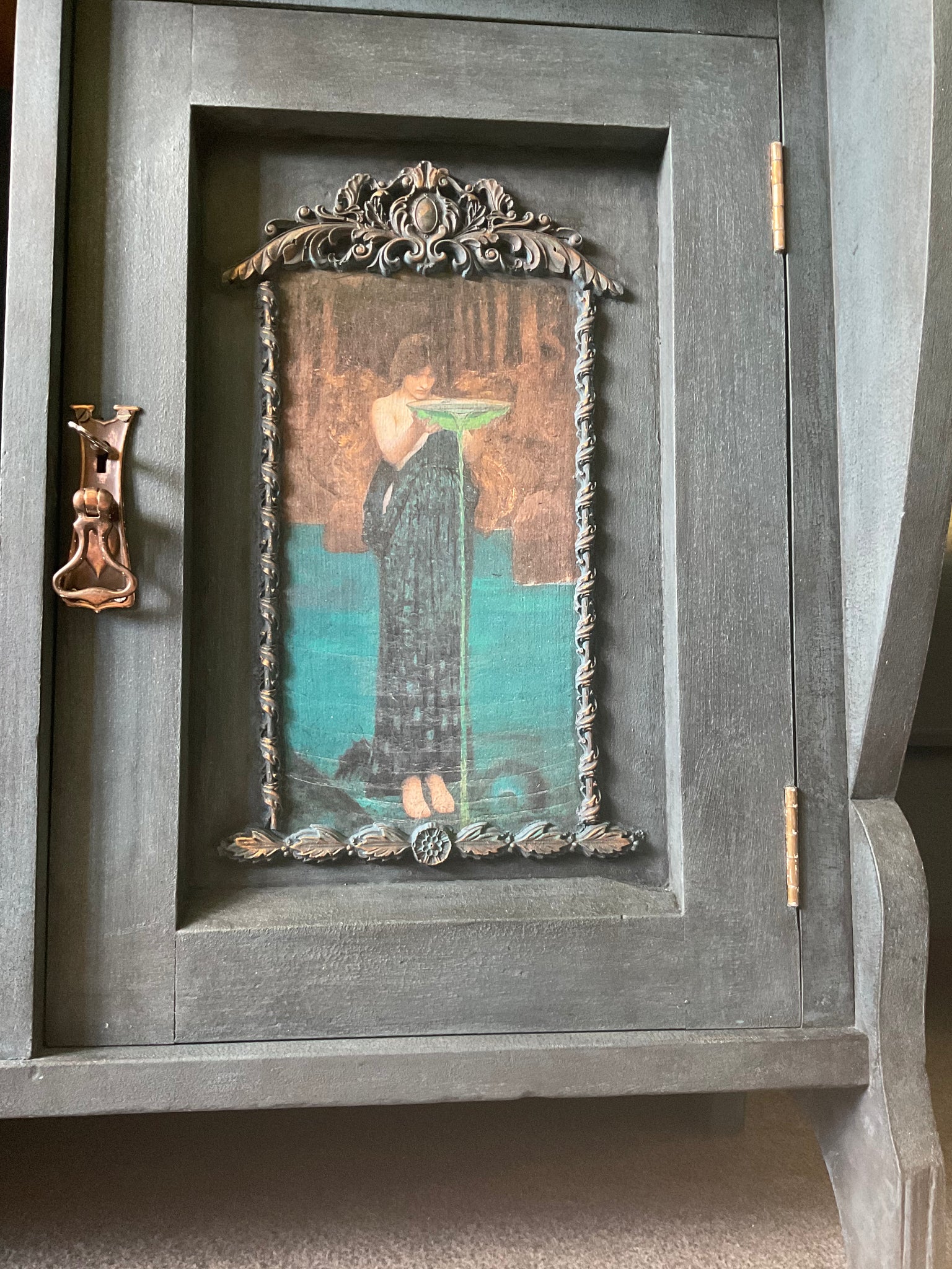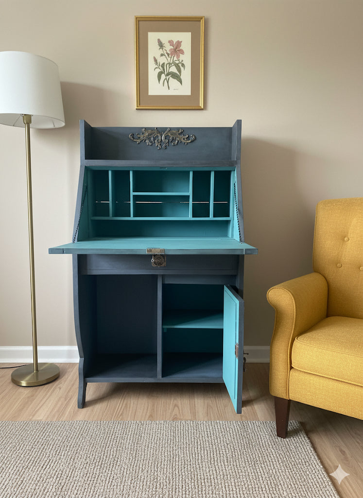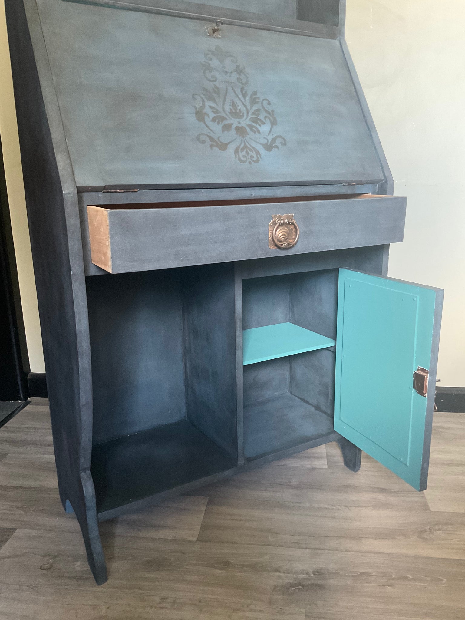 Add a touch of old-world romance to your space with this beautifully reimagined secretary desk. Hand-finished in soft, moody blue hues with a delicate gold stencil and ornate detailing, it’s a perfect blend of vintage character and artistic flair. The drop-front writing surface, charming storage cabinet with a unique decoupaged panel, and copper hardware make it as functional as it is beautiful.
