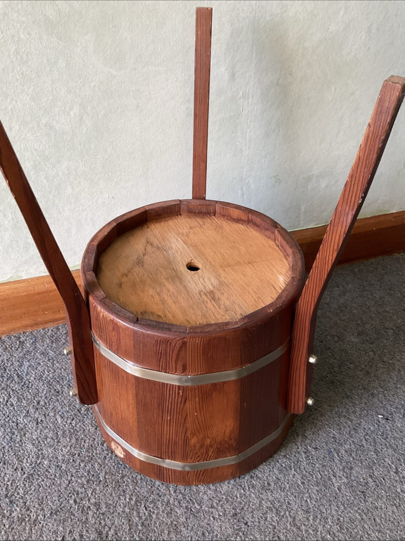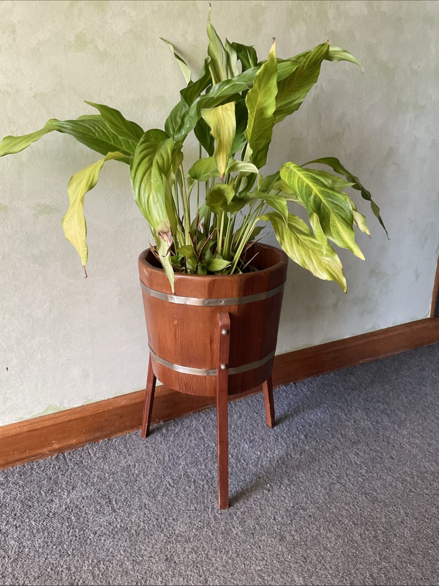 Metal bands and it stands on 3 legs. Fairly good condition considering its age, some minor scratches. There must of been a shops sticker on it, I can vaguely make out “garden park” but I’m not sure.
