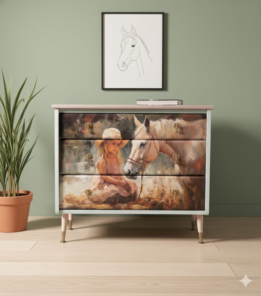 decoupaged drawer fronts with a beautiful horse and a girl.