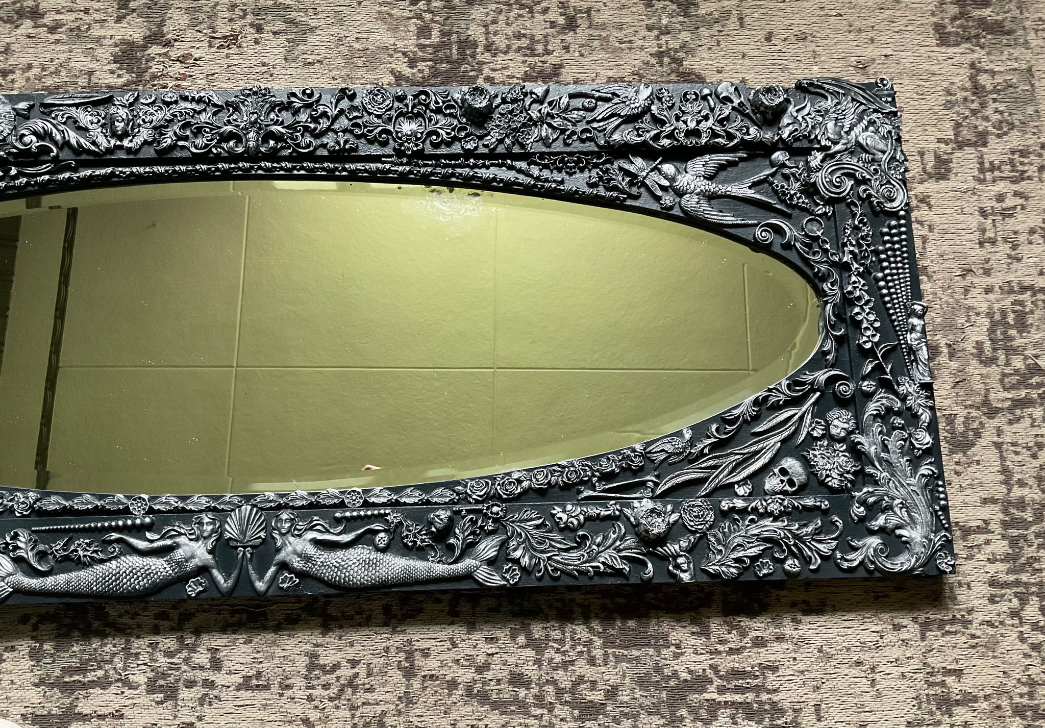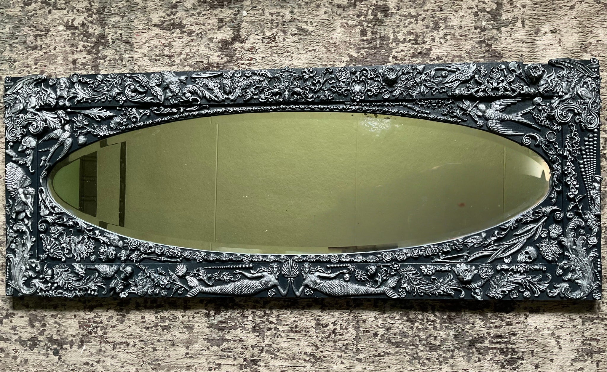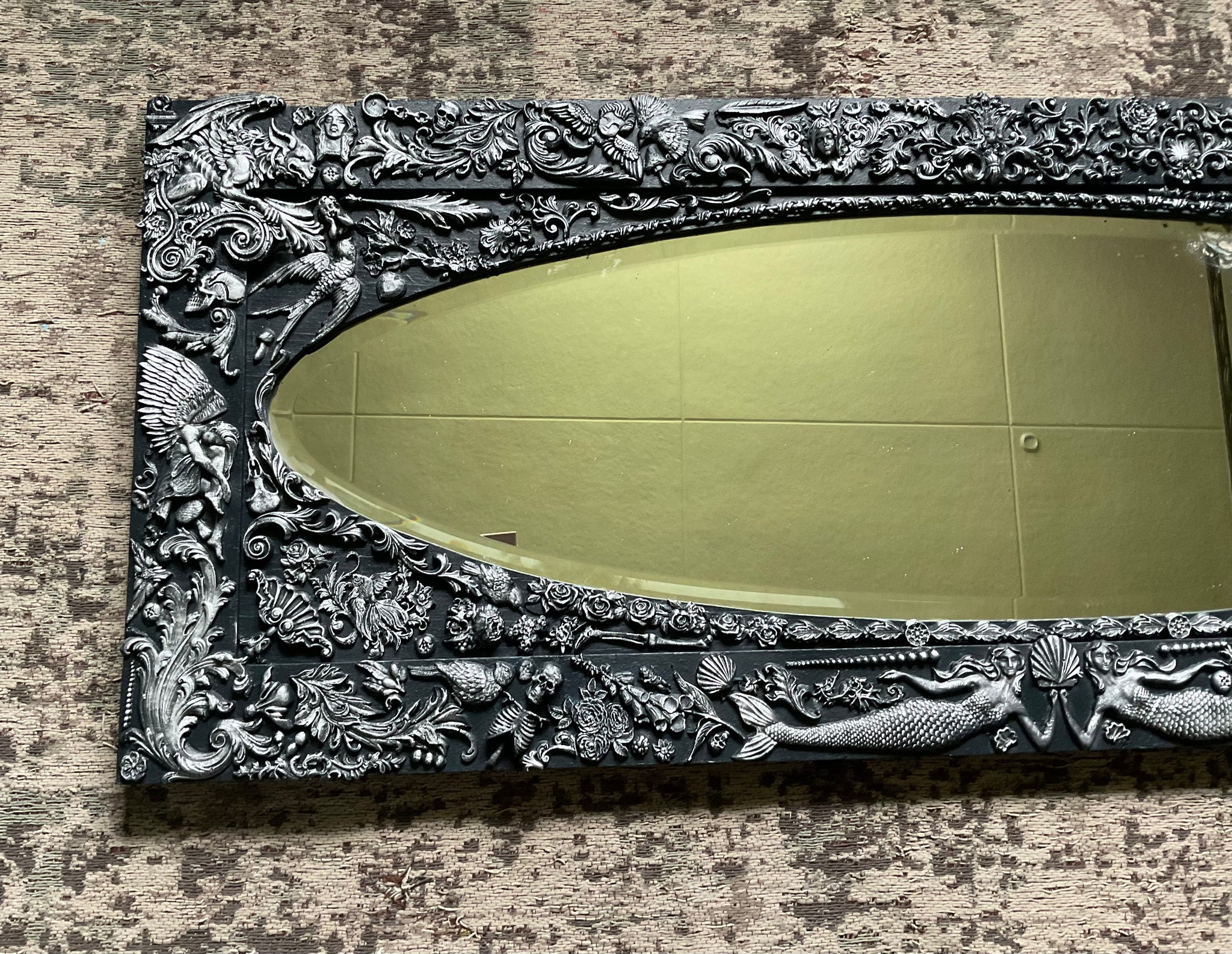 This striking oversized mirror began its life as a mirror door from a vintage wardrobe and has since been repurposed as a dramatic wall mirror