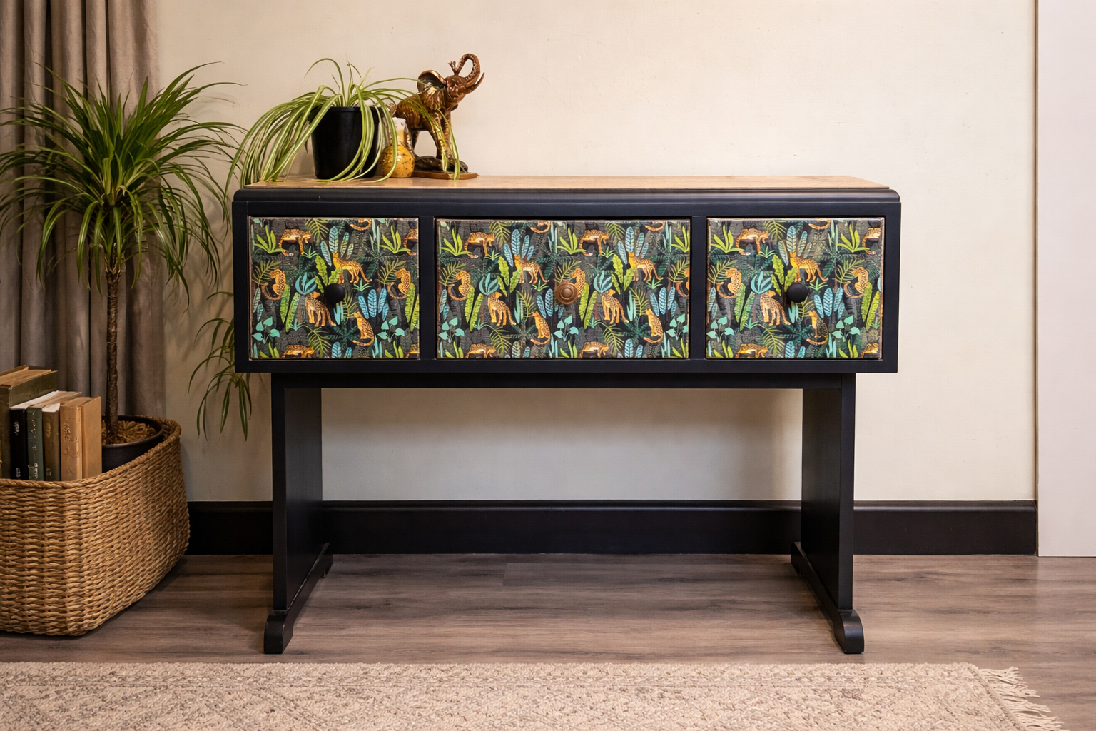 Beautifully refinished statement console table featuring striking jungle-inspired drawer fronts with leopards and lush foliage. Finished in a deep grey (nearly black) tone with a natural timber top, this piece blends bold design with practical storage.